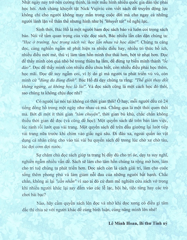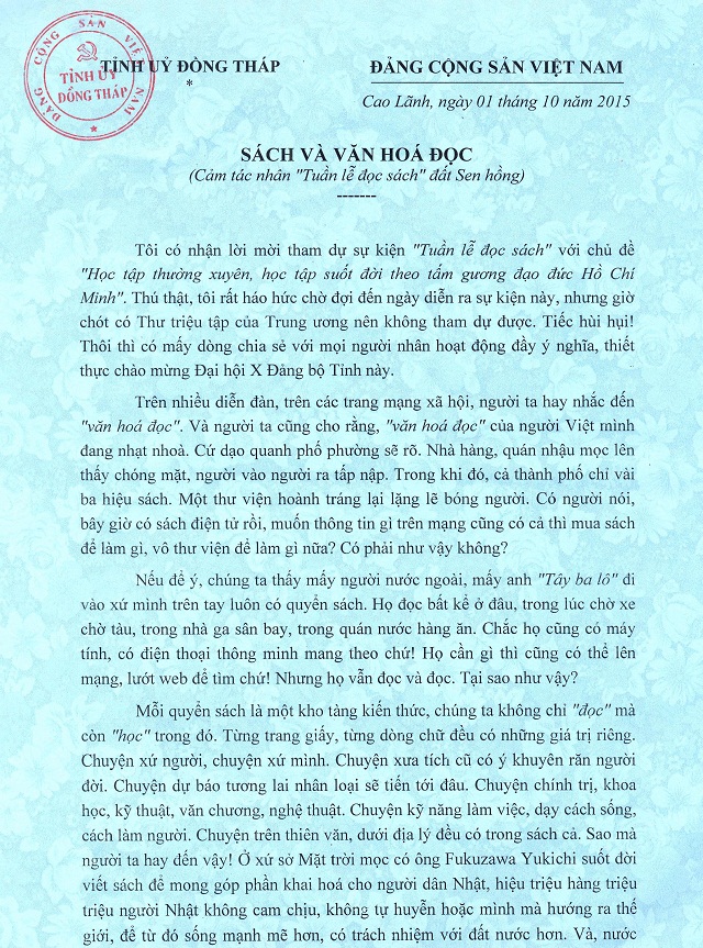 Thư gửi của Bí Thư Tỉnh ủy Lê Minh Hoan nhân “Tuần lễ học tập suốt đời” năm 2015
